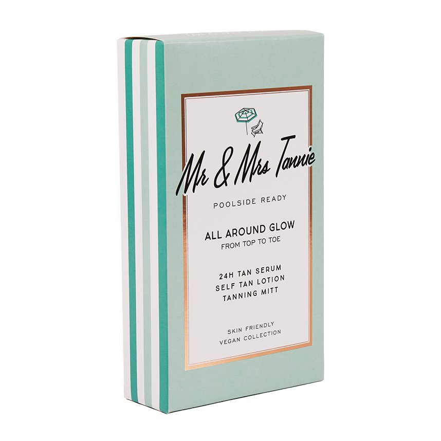 Integrate the 24 H Tan Serum into your normal skincare routine – morning and evening. Apply to cleansed face, neck, and décolletage. Blend into the hair line. Use daily until desired tan is achieved. Don’t forget to wash hands. Use daily until desired tan is achieved! Use the Self tan Mitt to spread and even out the Self Tan Lotion. Dispense product directly on to the mitt and work into the skin in circular motions. Wait until dry to protect clothes and sheets. Use daily until desired tan is achieved!